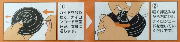 ナイロンコード2.4mm×5mをカッターに差込み後は手で回してコードを巻いていくだけ。